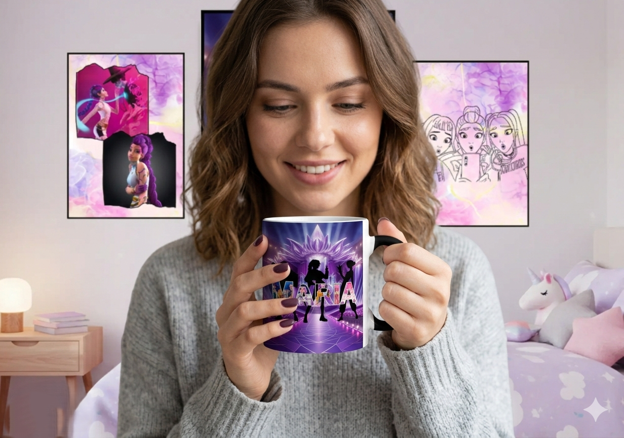 Siéntete la estrella de tu propio concierto con esta taza exclusiva. Diseñamos un escenario Kpop espectacular en tonos púrpura y fucsia, con una gran flor de loto central e iluminación dramática. Lo mejor: personalizamos el centro con las siluetas de un grupo de chicas idol y tu nombre escrito con letras grandes y detalladas, como un 'fan-collage'. No es solo una taza, es un escenario donde tú eres la protagonista cada mañana.
